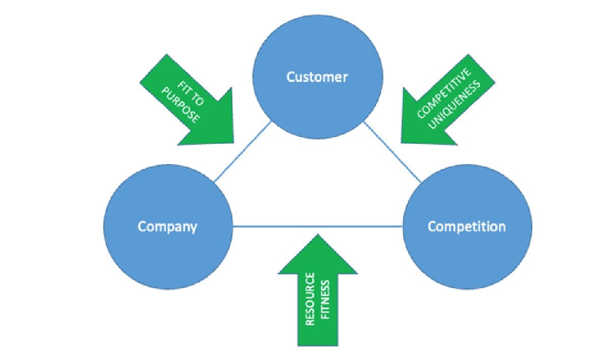 Strategy is often described in terms of the dynamic between three Cs – your company, your customers, and your competitors (for a great discussion of this idea, read ‘The Mind of the Strategist’ by Kenichi Ohmae). There is a tendency among people to focus on the apexes of the triangle and consider the motivations of each of the three actors in isolation, but the real source of insight is to look at the sides of the triangle and how the points interact, as seen below.