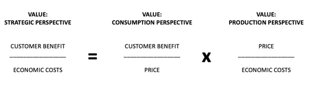 To a consumer, value is the anticipated benefits relative to the price (marketers understand this well); to a producer, it is the price relative to the full costs of production (finance people understand this well).