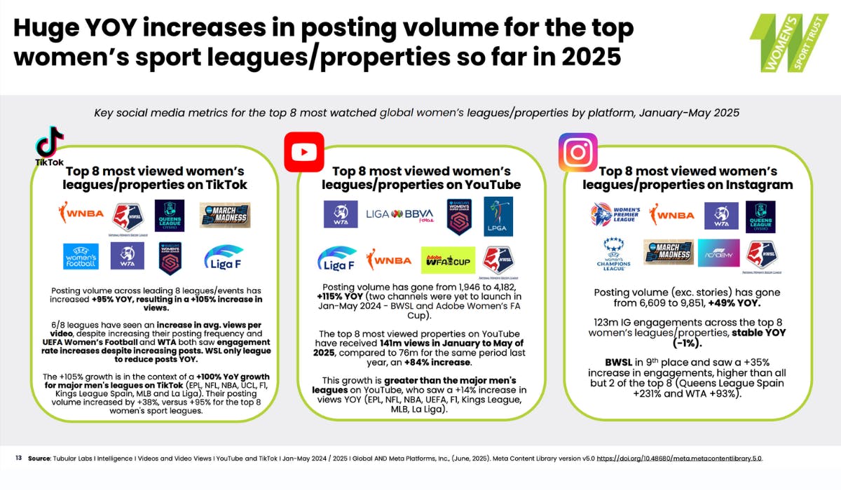 The first five months of 2025 saw a 105% increase in TikTok views for the eight most-viewed women’s sport accounts on the platform. On YouTube, this figure is 84%.