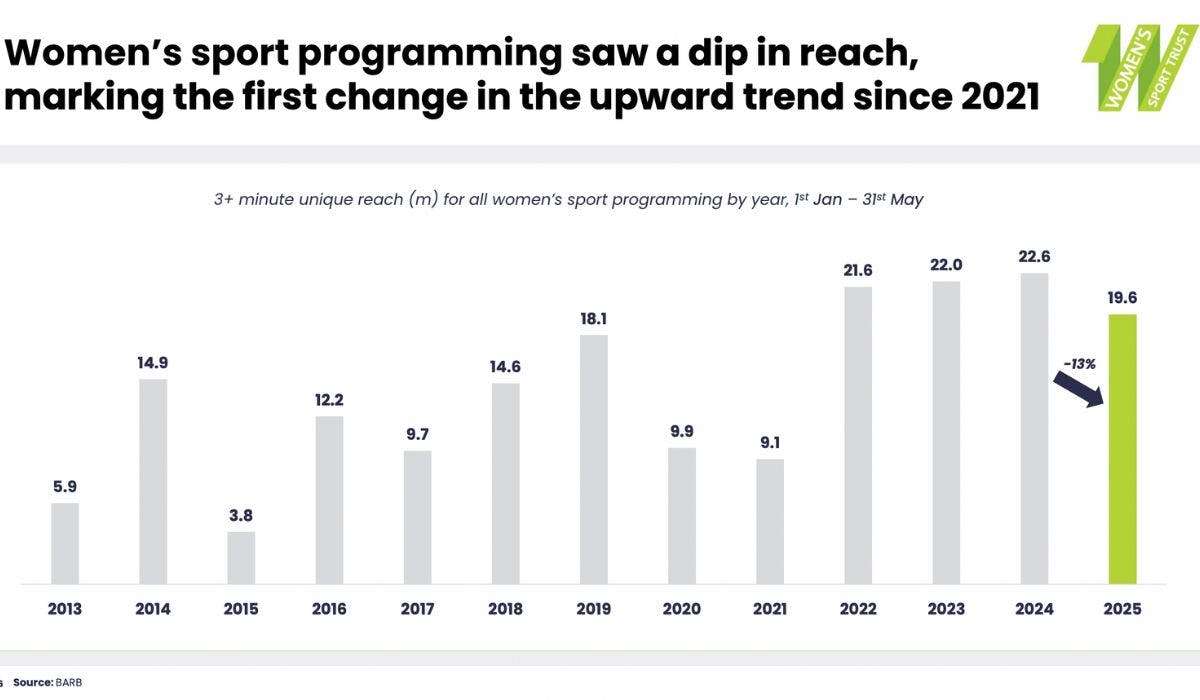 While broadcast viewership is down 13%, women’s sport’s growth on social platforms such as TikTok and YouTube suggests a different trend is emerging.