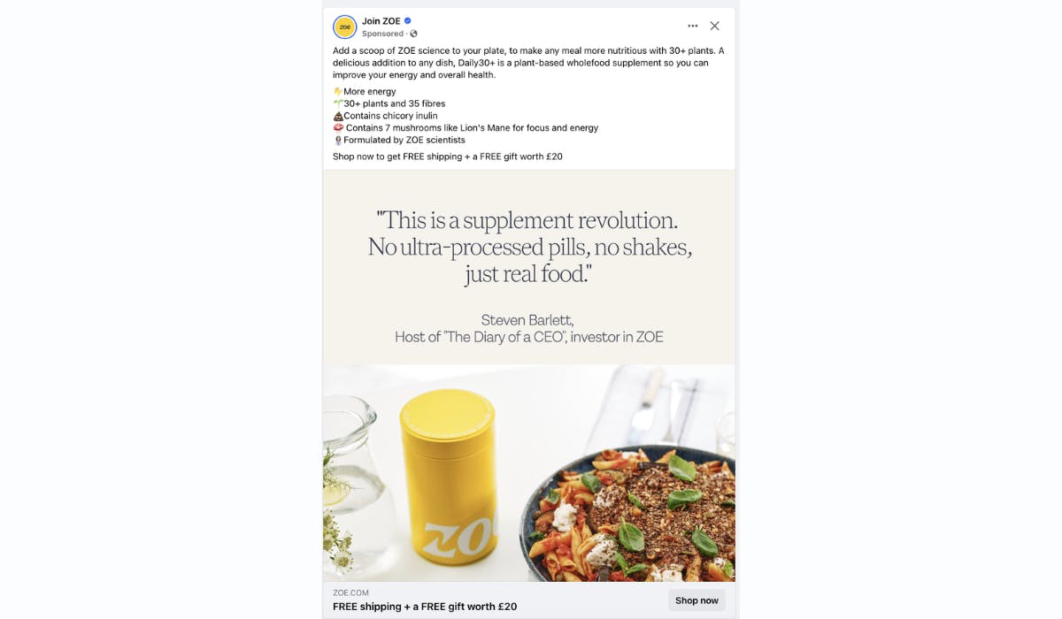 The Advertising Standards Authority (ASA) has banned a Facebook ad by nutrition startup Zoe after it found the brand’s claim that its Daily30+ supplement was free from ultra-processed (UPF) ingredients was likely to “mislead” consumers.
