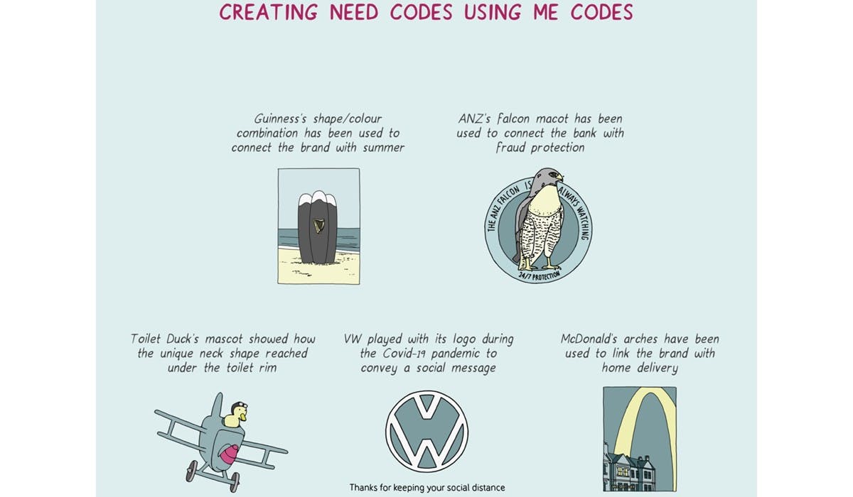 - Me codes – timeless cues that uniquely identify the brand (e.g. McDonald’s arches).