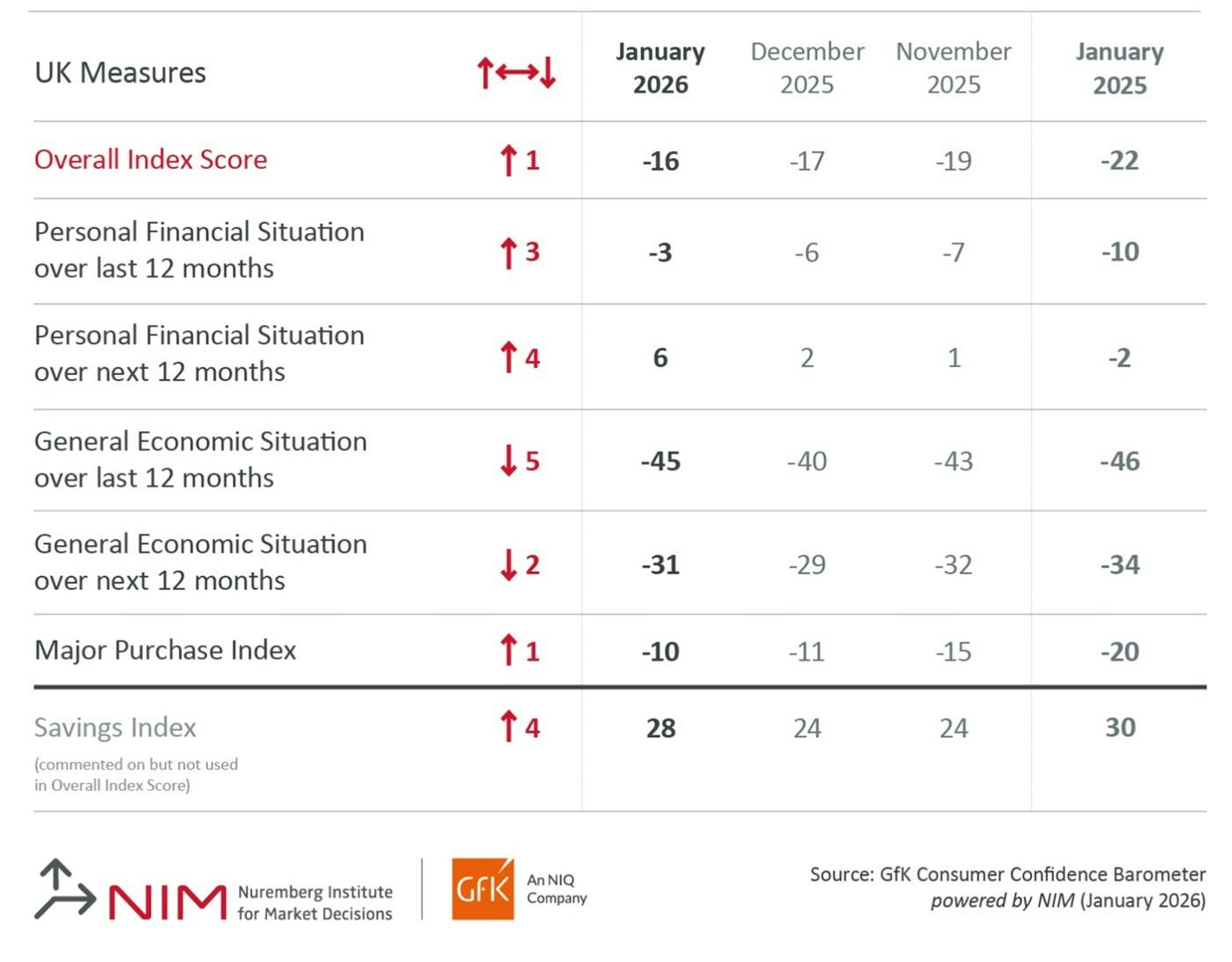 While the GfK Consumer Confidence Barometer powered by NIM shows a slight improvement in January, with the overall index score up one point to -16, it remains firmly in negative territory.