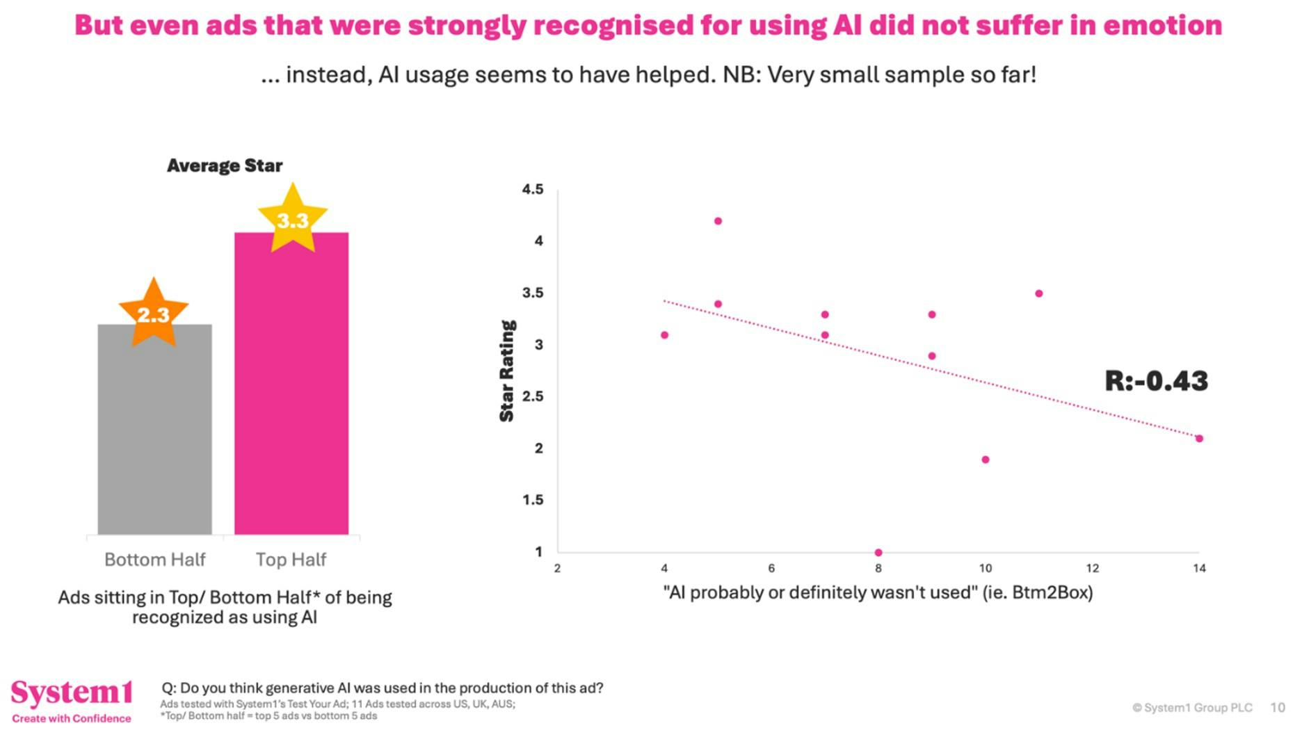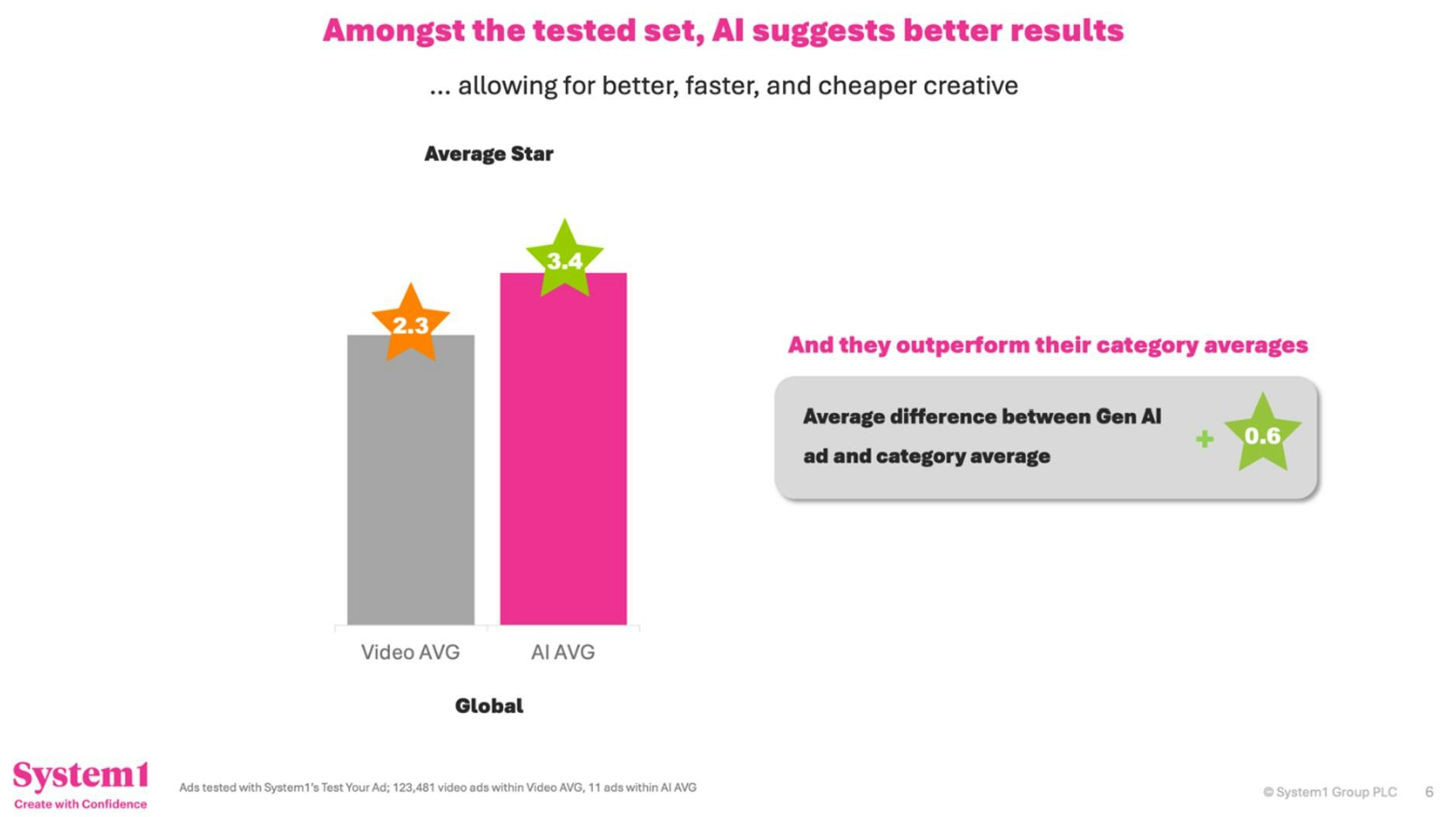 The results of our study showed the AI ads got an average star rating of 3.4 from System1, versus an average of 2.3 in its total database of 123,000 video ads.