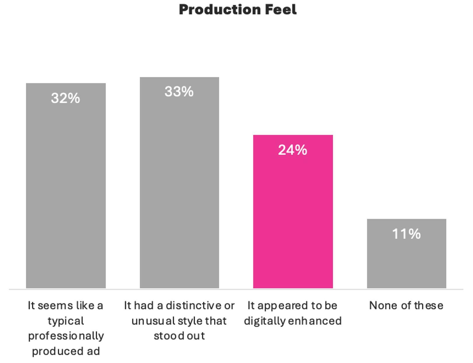 We didn’t want to trigger any respondents’ biases about AI, but when asked about production style, around a third (32%) of respondents thought the ads looked like a ‘typical professionally produced ad’. Another third (33%) had an even more positive view that the ads ‘had a distinctive or unusual style that stood out’.