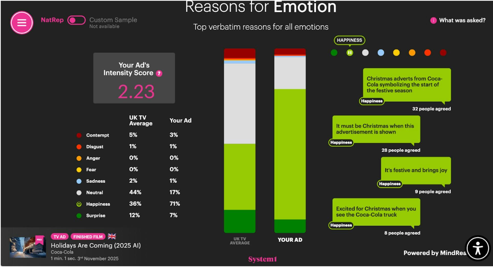 Coke’s 2025 ‘Holidays are coming’ film is as loved, if not even more loved, in its latest AI incarnation, as in any of its previous CGI versions. It scored System1’s maximum 5.9 stars, with. 71% of the total emotional response it evokes being ‘happiness’, versus a category average of 36%.