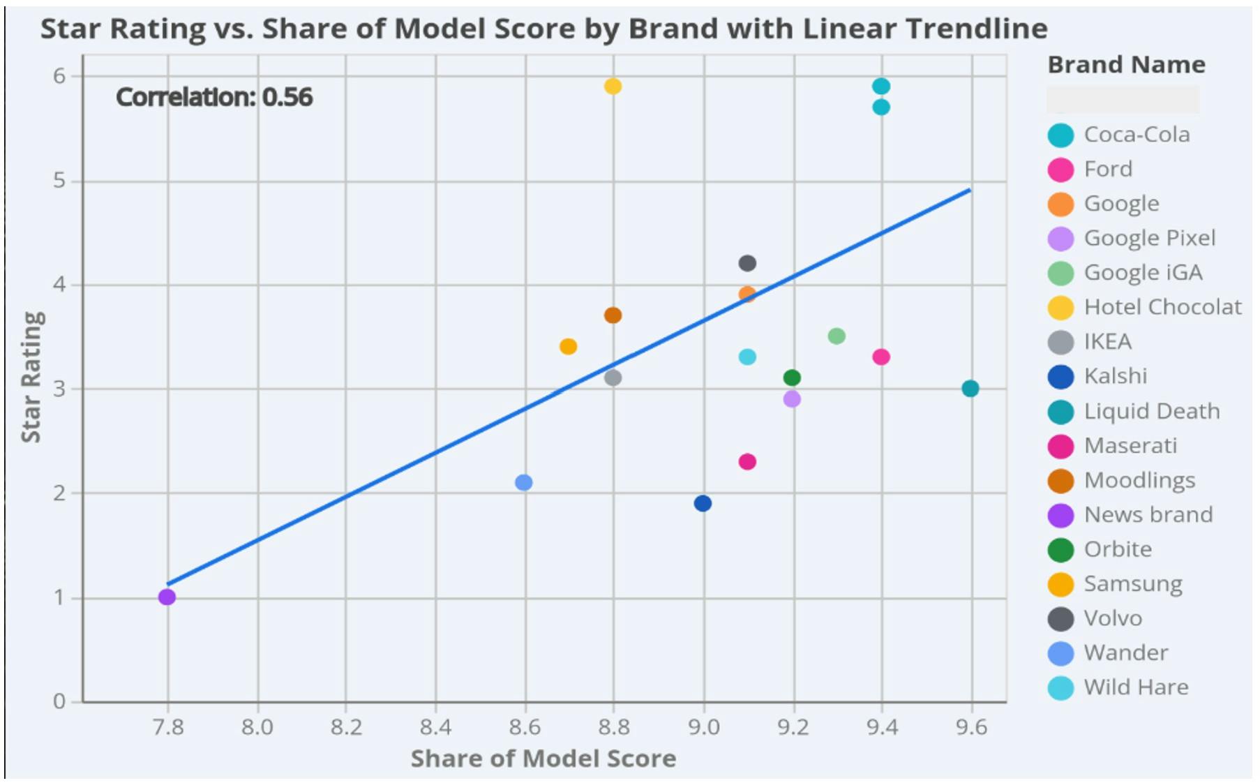We tested all 18 ads in Jellyfish’s Share of Model platform and the ads all scored between seven and nine out of 10. We see that LLM scores tend to be a little more generous than System1 scores, but brand by brand they follow a similar pattern to System1 testing. The top, middle and bottom ads in System1 and Share of Model were the same.