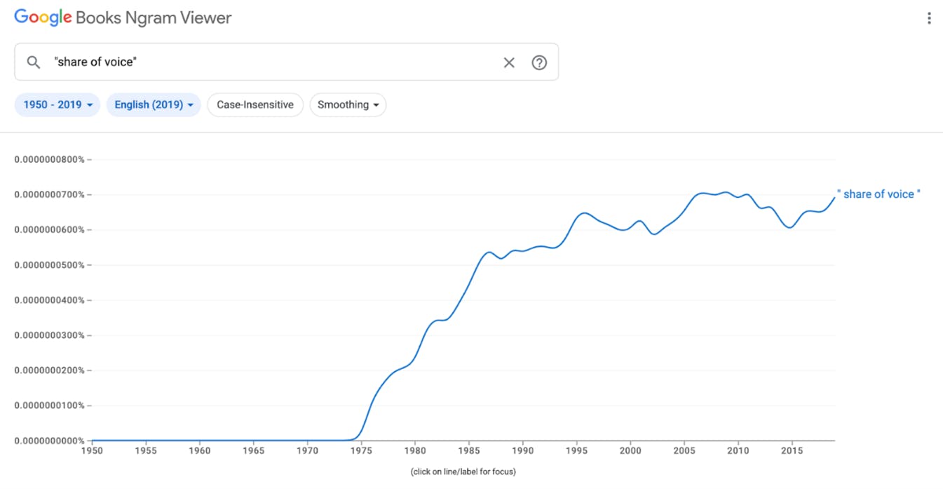 Marketing’s next big ‘share of’ metric, share of voice (SOV), is essentially the concept of market share applied to media spend, and was especially useful in the pre-digital mass media. Les Binet, adam&eveDDB’s head of effectiveness, directed me to the fact that Unilever had pioneered the use of SOV as far back as the 1960s, although the company kept quiet about this at the time.