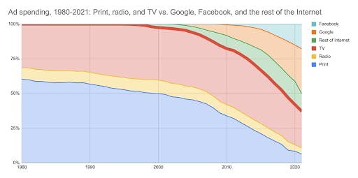 A fundamental factor is good old-fashioned market forces and the ongoing battle for market share of global ad spend by the platforms. Google and Meta built an unprecedented share of global advertising spend over the last two decades, initially from dominating companies’ lower-funnel budgets and by making direct response advertising vastly more accessible to millions of small companies than it had ever been before.