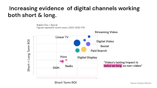 According to econometrics company Analytics Partners, most digital channels are capable of contributing to the long as well as the short term. The importance of video for brand-building is also evident in their analysis, the lasting impact of video channels typically being twice as long as non-video channels.
