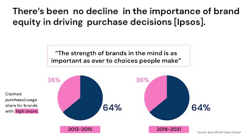 Well no, as it turns out. There’s actually been no decline in the importance of brand equity in the purchase decisions people make according to Ipsos’ ‘Brand Value Creator’, which suggests that “strength in the mind remains as important as ever as a driver of purchase decisions” – staying at the same level across its entire global database over the 2018-21 period as during 2013-15.