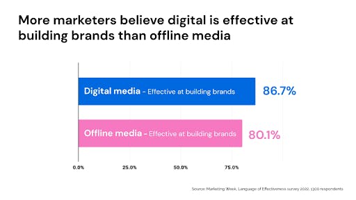 Actually Marketing Week’s latest ‘Language of Effectiveness’ survey of over 1,300 marketers suggests digital is far more mature for brand-building than others may believe. In fact a huge number, 86.7%, believe digital media is effective at brand-building, which is more than the 80.1% who believe offline media is effective at building brands.