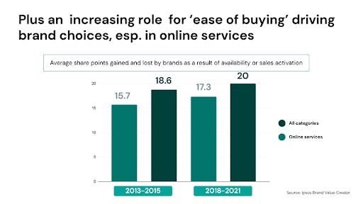 Ipsos data also suggests that ‘ease of buying’ as a factor in purchase decisions has grown over the same period, especially in online services categories, suggesting that whilst brands are still being built in the digital age, digital channels may also be creating greater opportunities to close the sale. Digital has been additive for marketing, not subtractive.