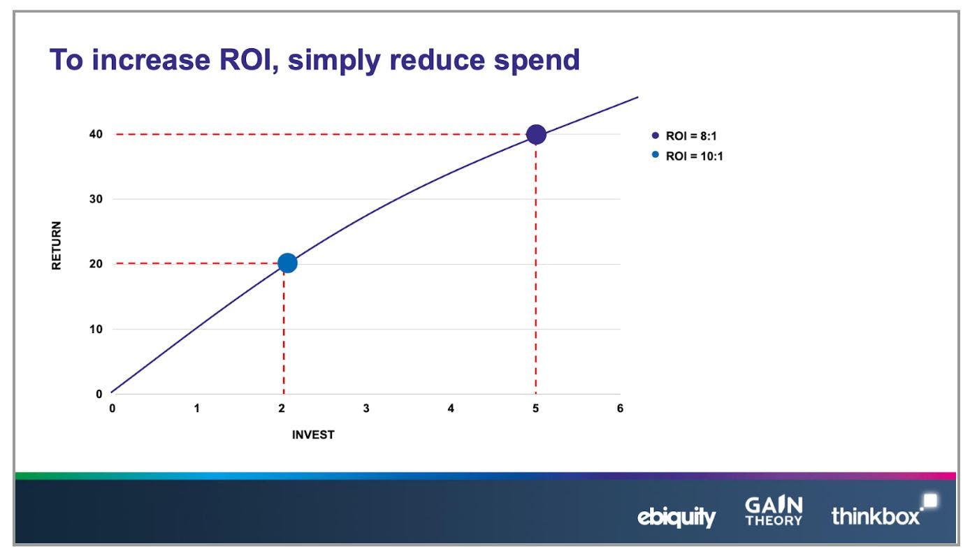 ROI tends to inversely correlate with profit growth, as due to diminishing returns ROI decreases as you spend more, and increases as you spend less. So the easiest way to increase your ROI is to decrease your media spend. Focusing on increasing ROI would therefore limit growth or even “send you broke” as Byron Sharp says.