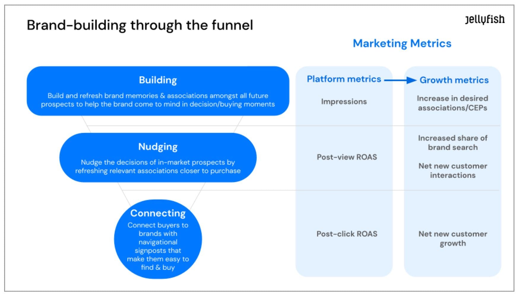 Below is a version of the standard ‘awareness-consideration-conversion’ funnel created to try and bring the performance and the brand marketing worldviews together and a little more in line with how brands grow and how advertising works. To build brands in people’s minds, nudge people who are in-market towards choosing your brand, and to help connect people to a brand online who have already decided to purchase. It’s not perfect of course but it appears to resonate with marketers with usually quite different perspectives.