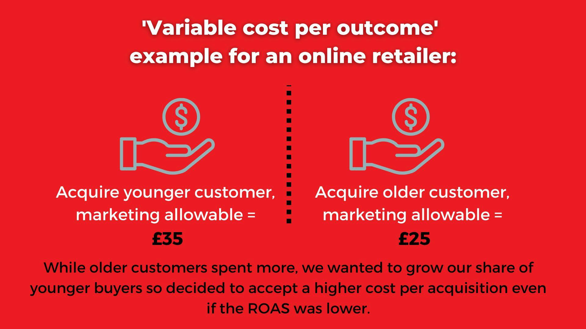 They are definitely trying to evolve. Many platforms now offer advertisers a much broader set of objectives and metrics than just ROAS or CPA targets, including reach and other brand goals. Some companies like ours have the expertise to bend the algorithms to make them work more effectively through the funnel. Being able to customise the analytics platforms now also means you can explore replacing ROAS as a target with other metrics that are more likely to incentivise actions that generate incremental growth from new customers, such as variable cost per outcome (example below), new SKU sales or rate of growth by territory.