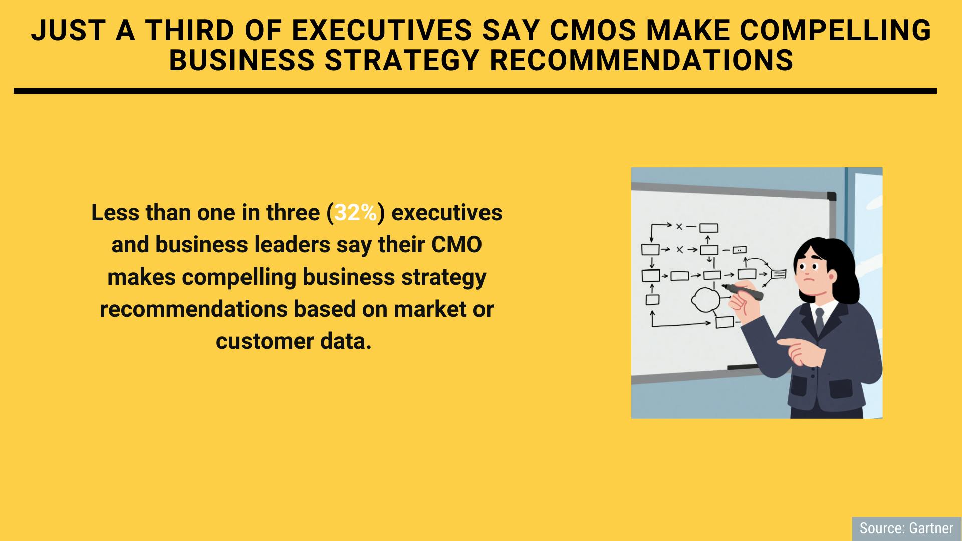 Less than one in three (32%) executives and business leaders say their CMO makes compelling business strategy recommendations based on market or customer data, according to a survey conducted by Gartner.