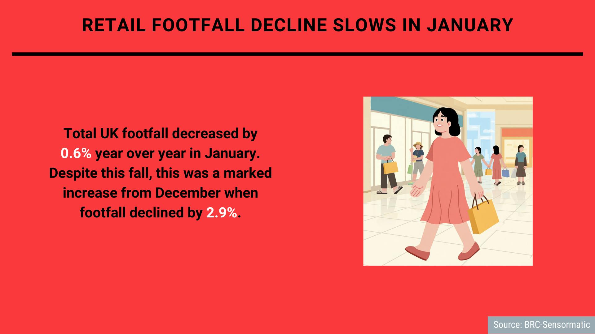 According to British Retail Consortium (BRC) Sensormatic data, total UK footfall decreased by 0.6% year over year in January. Despite this fall, this was a marked increase from December when footfall declined by 2.9%.
