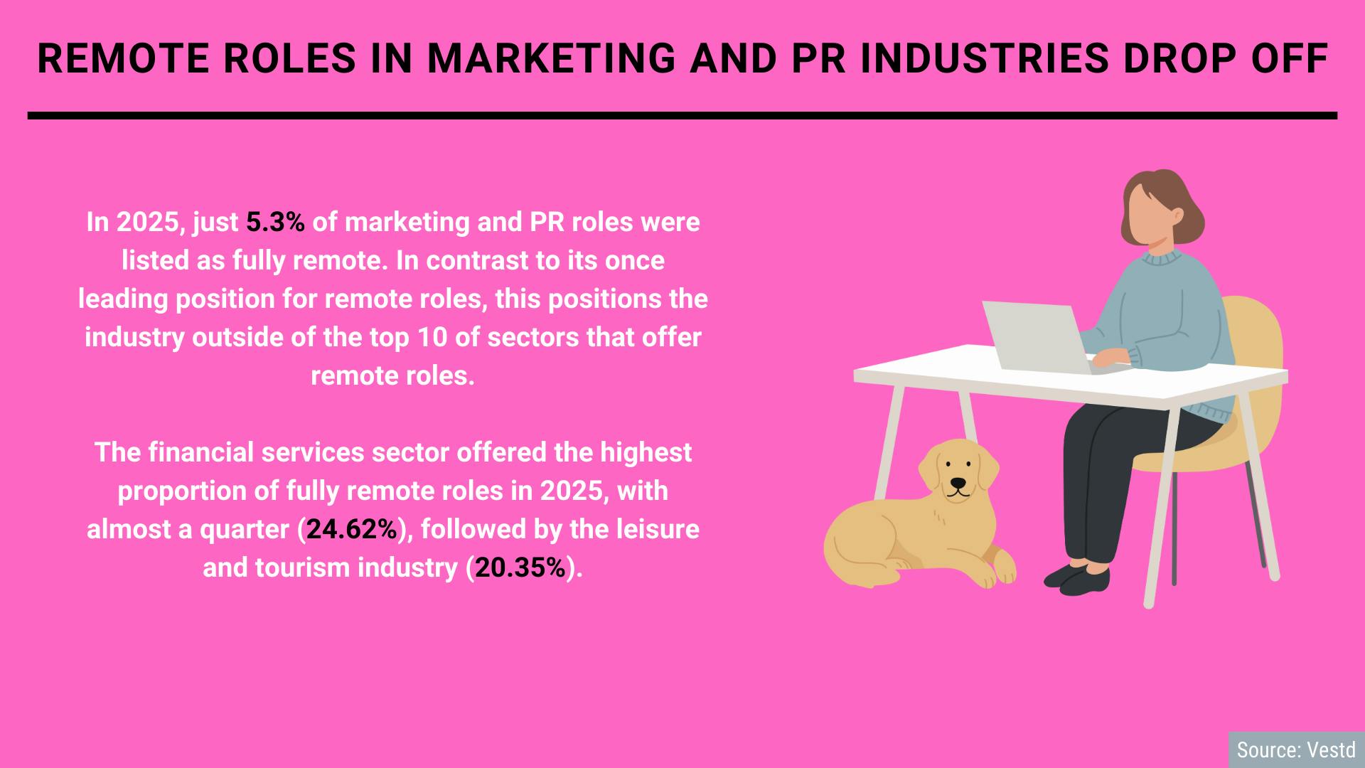Back in 2022, marketing and PR had the highest proportion of fully remote roles out of any industry; however, in 2025, the sector dropped out of the top 10, according to analysis of job listings from Vestd.