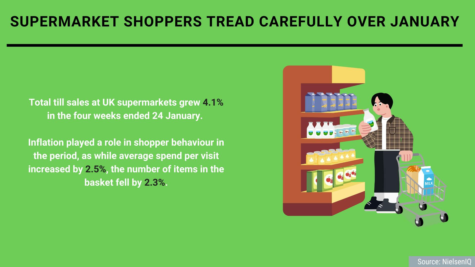 Total till sales at UK supermarkets grew 4.1% in the four weeks ended 24 January, according to data released by NielsenIQ (NIQ).