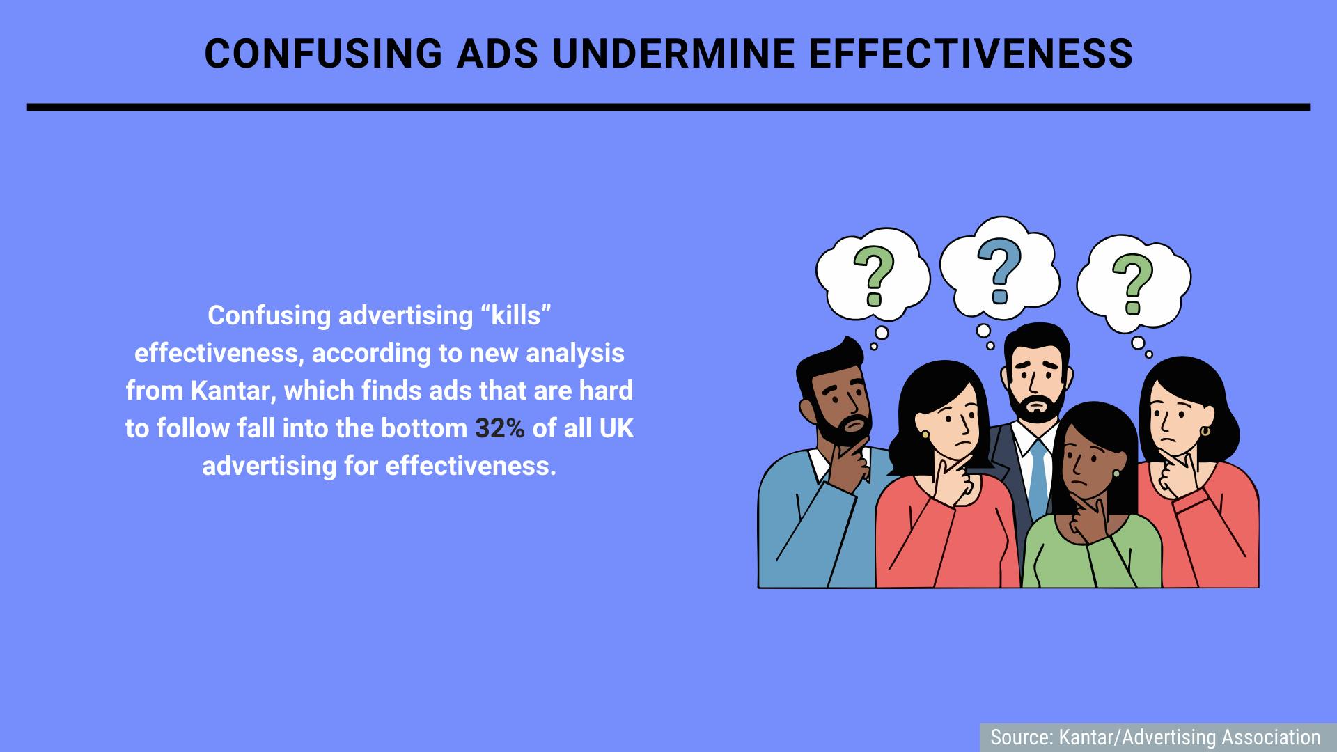 Confusing advertising “kills” effectiveness, according to new analysis from Kantar, which finds ads that are hard to follow fall into the bottom 32% of all UK advertising for effectiveness.
