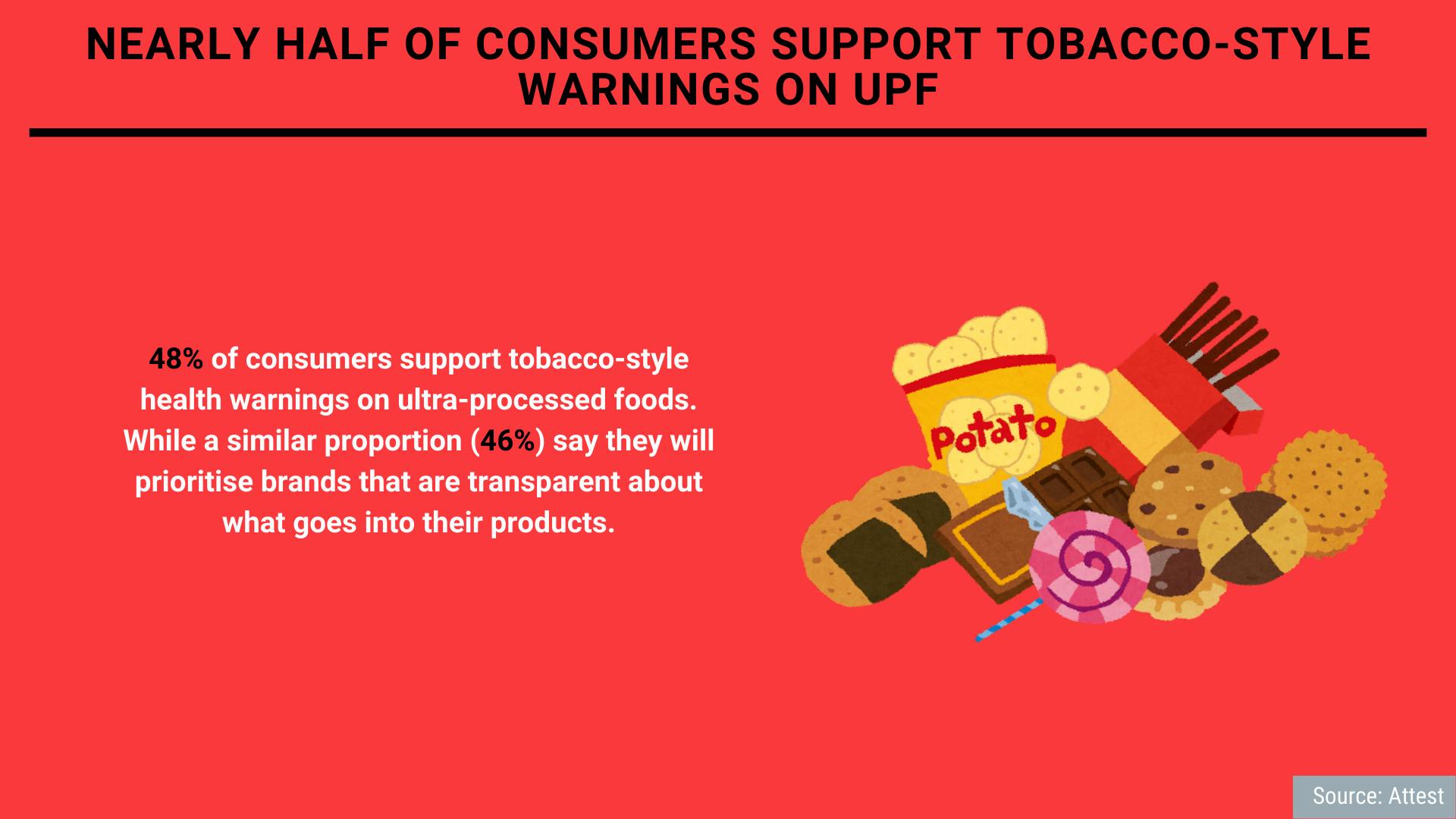 Research from Attest suggests almost half (48%) of consumers support tobacco-style health warnings on ultra-processed foods. While a similar proportion (46%) say they will prioritise brands that are transparent about what goes into their products.