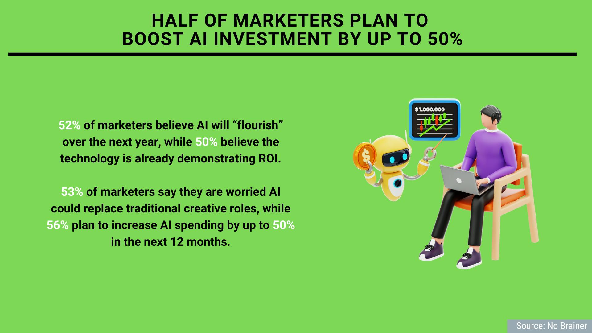 According to No Brainer’s 2025 Marketing Trends Report, 53% of marketers say they are worried AI could replace traditional creative roles, while 56% plan to increase AI spending by up to 50% in the next 12 months.