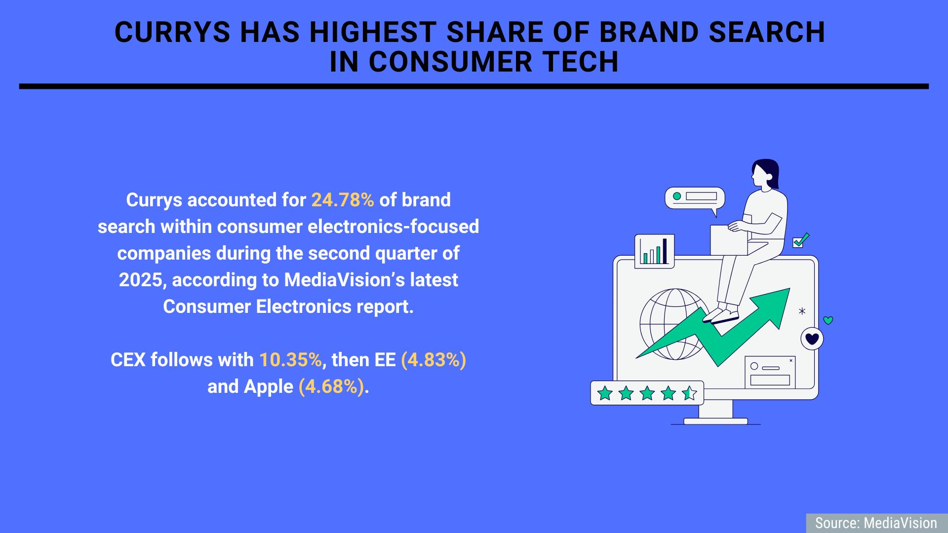 Currys accounted for 24.78% of brand search within consumer electronics-focused companies during the second quarter of 2025, according to MediaVision’s latest Consumer Electronics report.