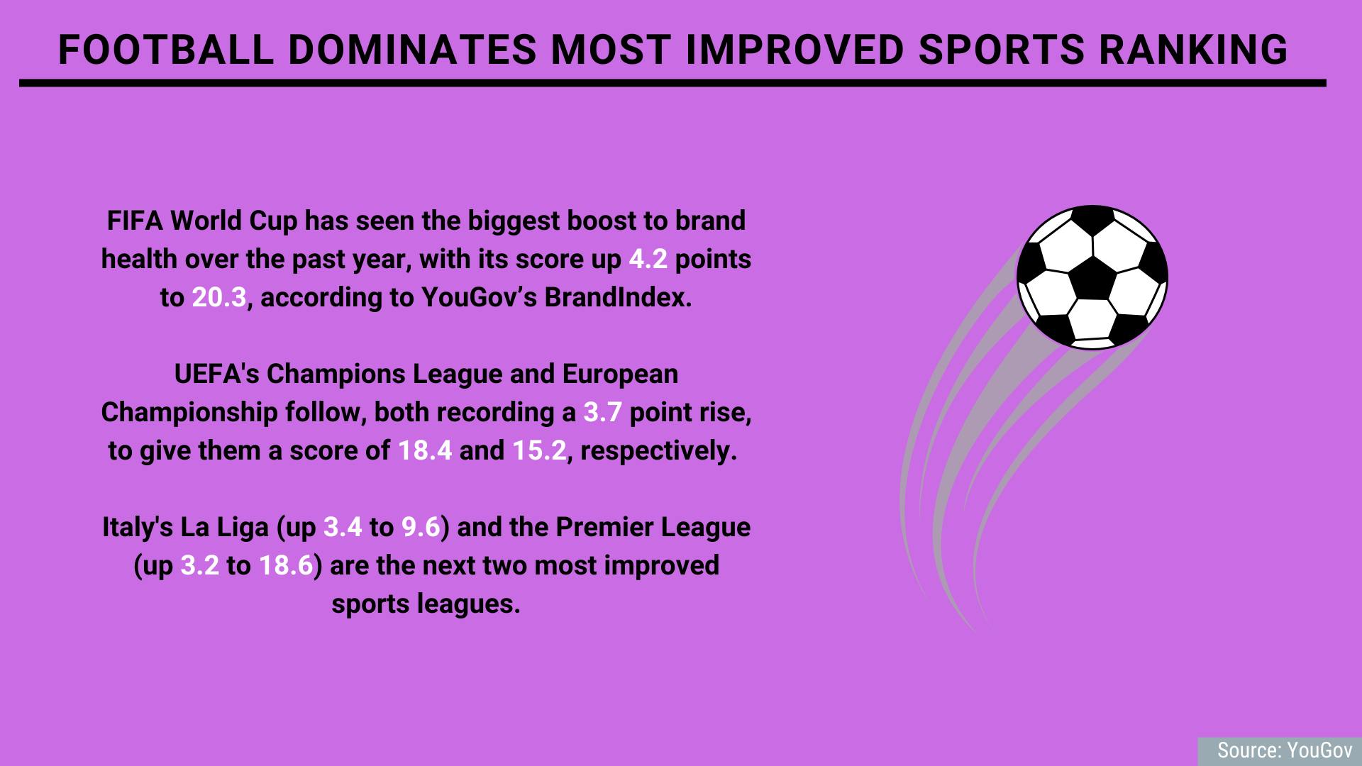 Of the top-ranked sports leagues and tournaments globally, the FIFA World Cup has seen the biggest boost to brand health over the past year, according to YouGov’s BrandIndex, with its score up 4.2 points to 20.3.