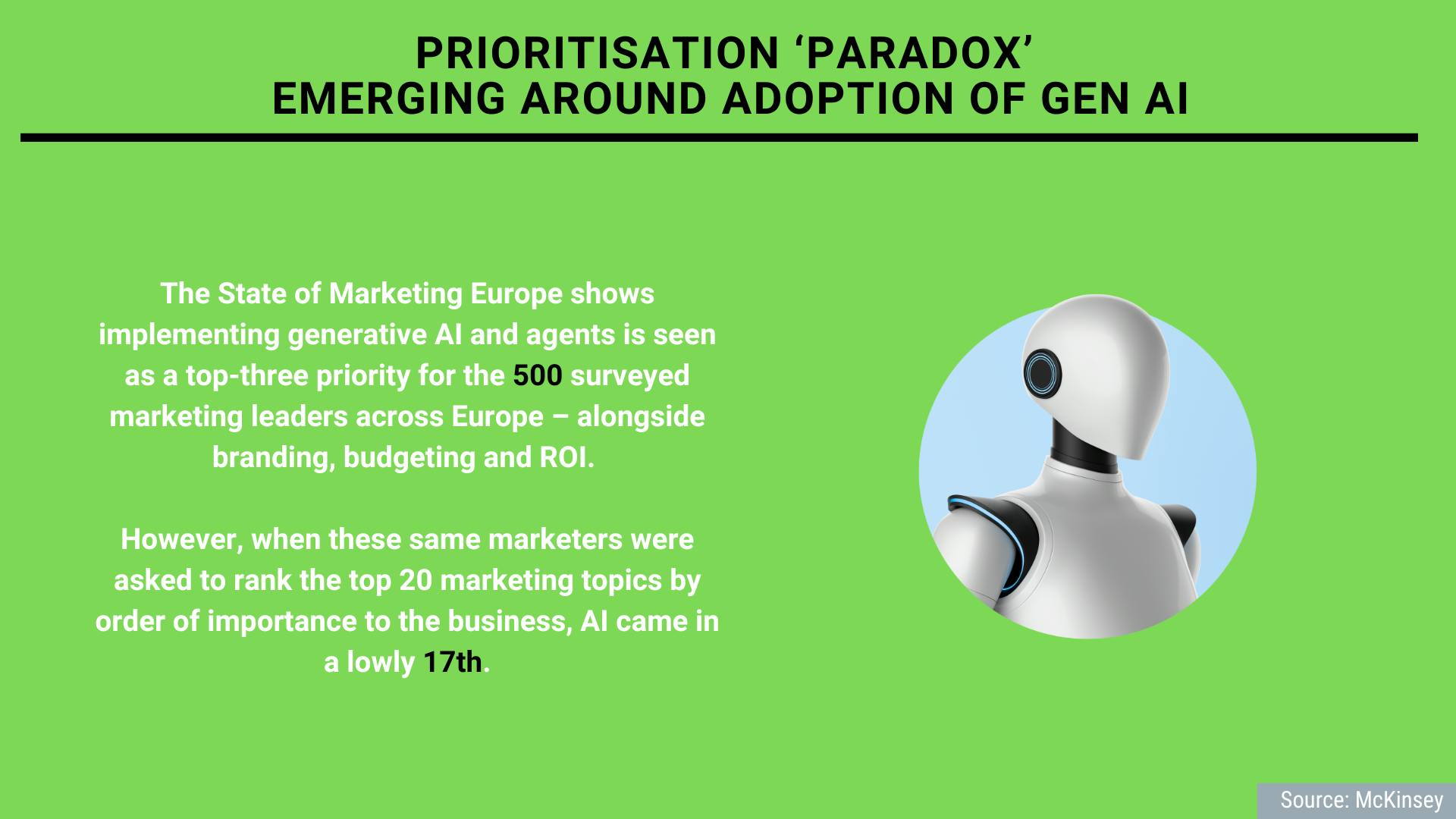 The State of Marketing Europe shows implementing generative AI and agents is seen as a top-three priority for the 500 surveyed marketing leaders across Europe – alongside branding, budgeting and ROI. However, when these same marketers were asked to rank the top 20 marketing topics by order of importance to the business, AI came in a lowly 17th.