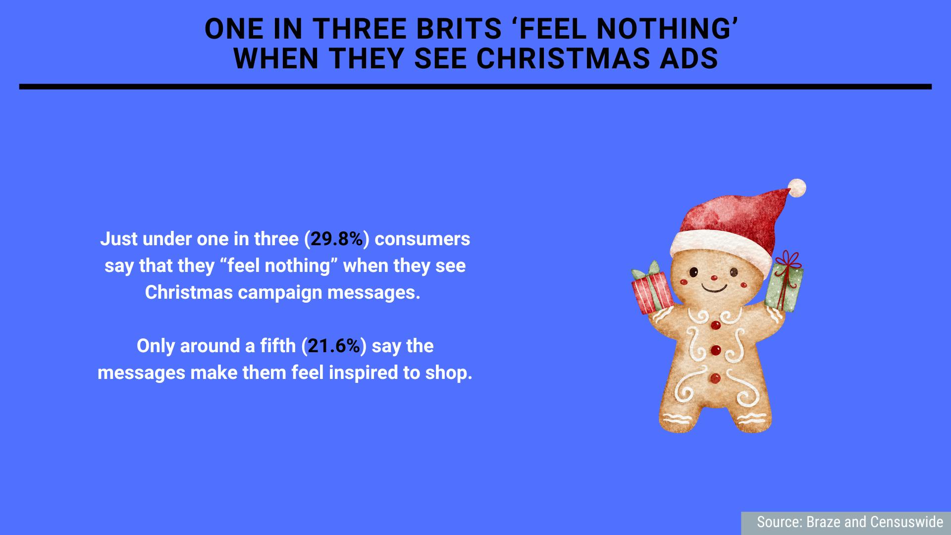 Just under one in three (29.8%) consumers say that they “feel nothing” when they see Christmas campaign messages. Only around a fifth (21.6%) say the messages make them feel inspired to shop, as is the intention behind many Christmas ads.