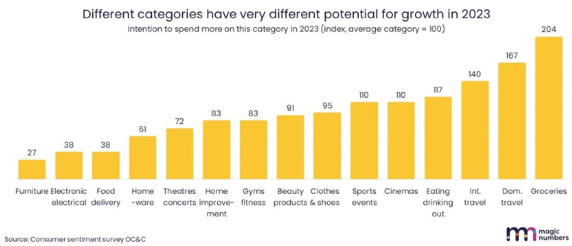 Looked at through this lens, 2023 budgets should be bigger for FMCGs where purchases are necessary, as well as travel, eating out, and experiences where there is still pent-up demand post-Covid. At the other end of the scale, furniture, expensive electronics and food delivery should save their media pounds until the recovery.