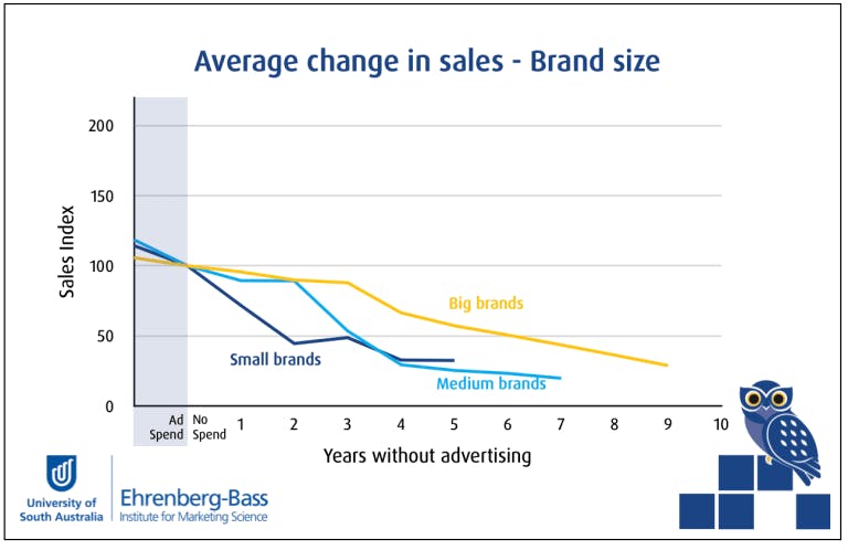 “The upshot is that bigger brands’ greater mental and physical availability will likely better insulate sales from decline after stopping advertising compared to smaller brands.”