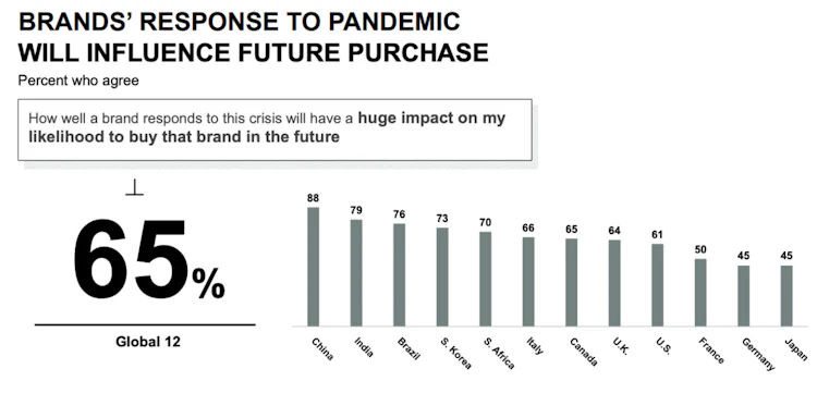 Asking consumers how much they agree with a statement like ‘How well a brand responds to this crisis will have a huge impact on my likelihood to buy that brand in the future’ tells us nothing, other than that Edelman need some help with their surveys. You could teach a whole semester on shit survey design with just this one question. Were they drunk when they devised it?