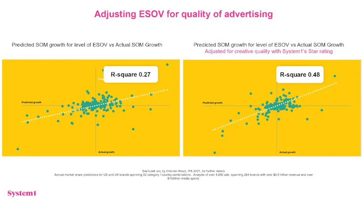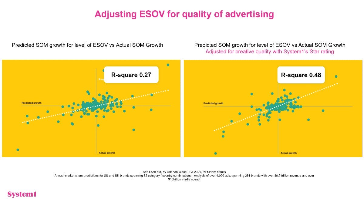 Wood demonstrated his theory with two charts, both comparing predicted and actual market share growth as a result of excess share of voice. The second chart also factors in how creatively effective a brand’s advertising is as measured by System1’s star rating system, which predicts the long-term effectiveness of ads based on viewers’ emotional responses.