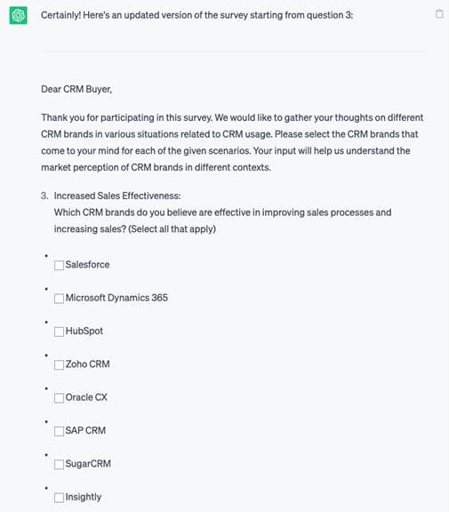 But in the meantime, ChatGPT can also write a survey to determine which brands come to mind in which situations. This is the kind of survey you would need to field to measure and optimise your mental availability: