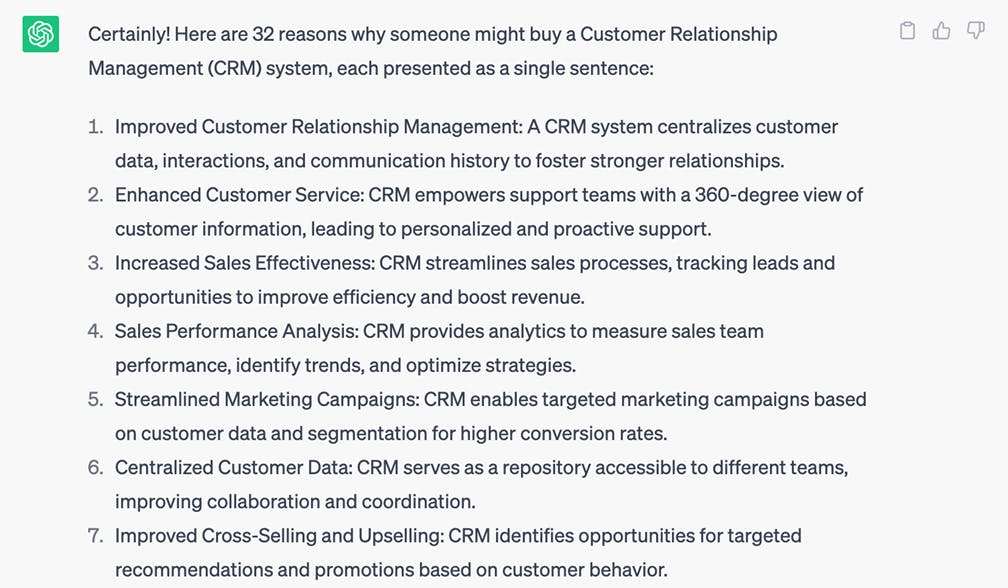 So, on a sunny Friday morning in New York City, we decided to ask ChatGPT to generate a list of 32 distinct reasons why buyers might purchase CRM. In about 20 seconds ChatGPT gave us 32 answers. Answers like “to give support teams a 360-degree view of the customer information, leading to personalised and proactive support”. See an example below.