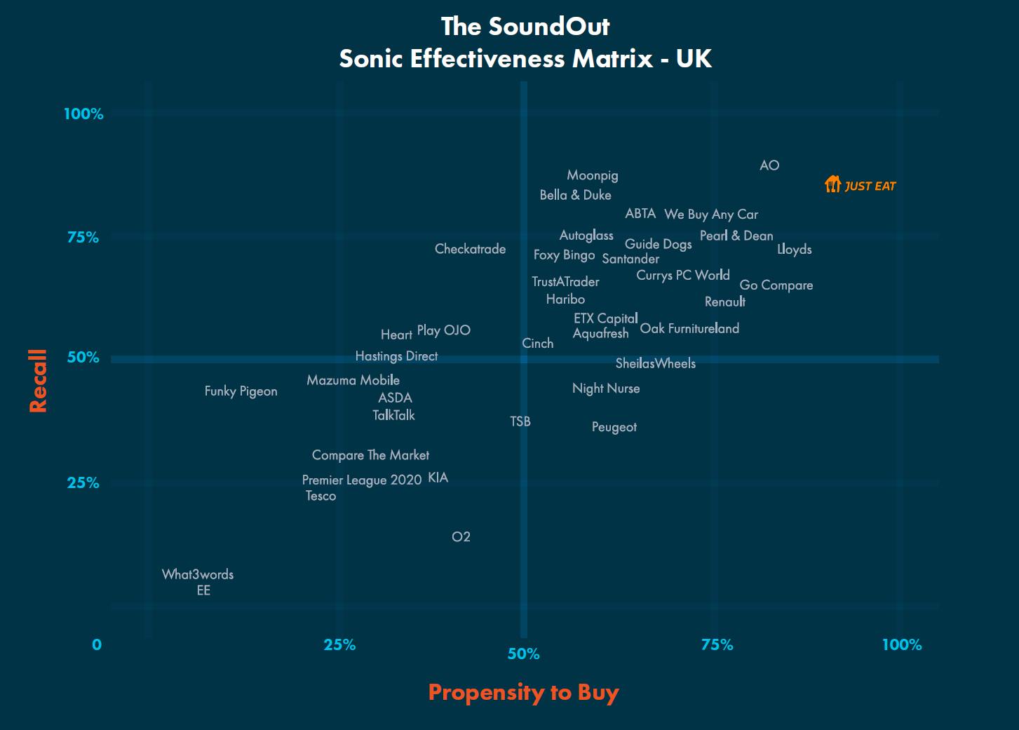 The best way to explain Soundout’s work is to look at one of the brands that performs best across the company’s analyses. Just Eat, for example, is one of the most sonically gifted brands in the UK.