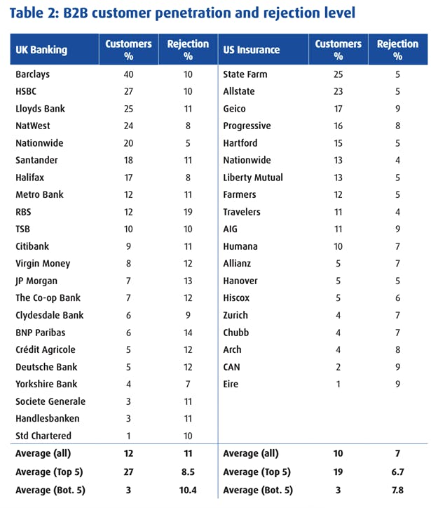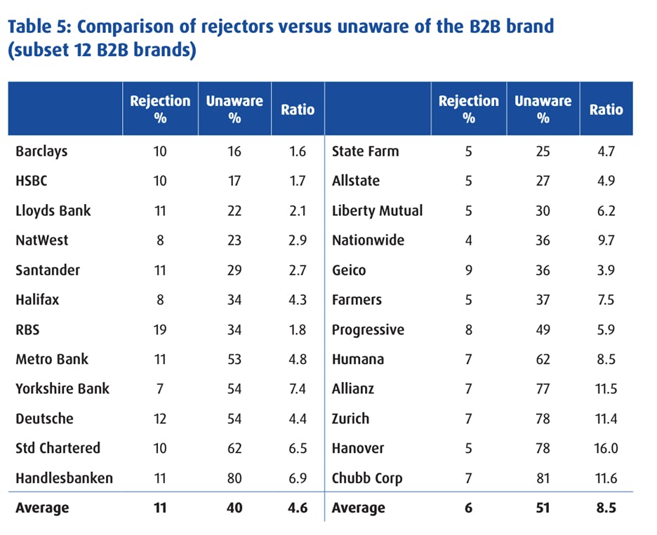 In B2B, Romaniuk examined two categories – business banking and business insurance – and found 11% and 7% of potential buyers, respectively, would reject a brand.