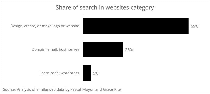 There are clues for creative development too. In gifting, the words ‘warm’ and ‘cosy’ appear often in the anniversary gifts bucket. And in the website building category, shown below, people put the words ‘design’ and ‘create’ into Google much more often than techy functions like ‘server’ or ‘host’.
