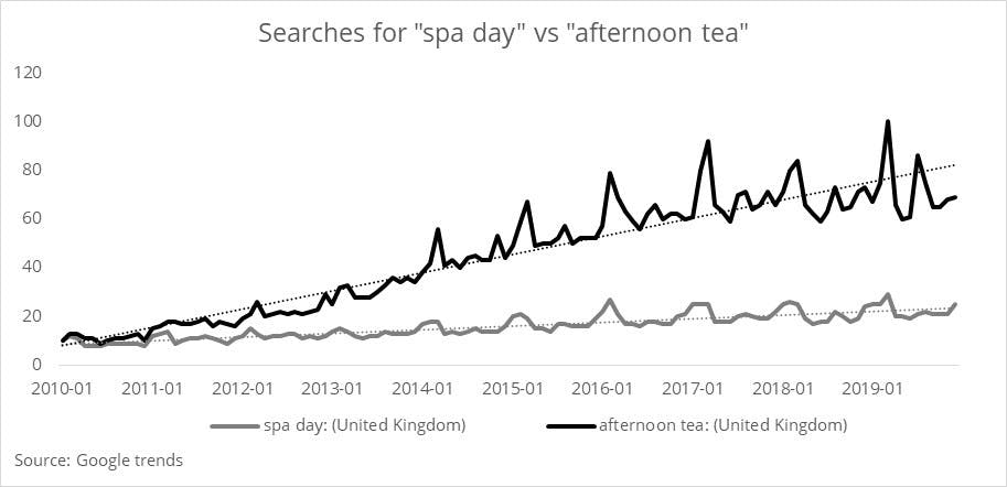 And gifting brands with hotel partnerships might be able to profitably use the fact that, within the 18%, ‘spa day’ is most often searched, but ‘afternoon tea’ is second biggest and growing quicker.