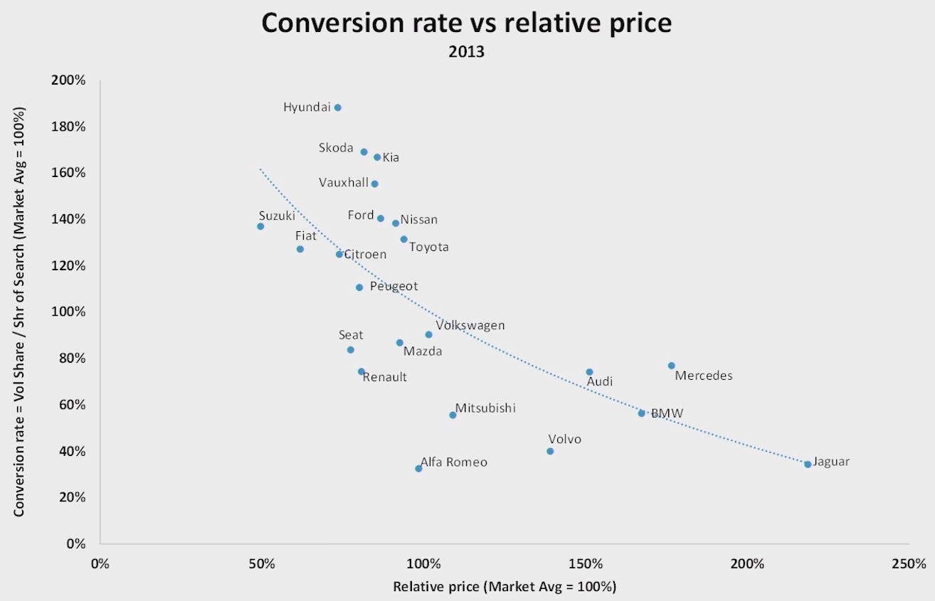 Les Binet does, of course, understand this. In his talk at EffWeek in October, he introduced the chart below. It shows how, in his example category of cars, conversion from share of search to market share depends heavily on the price different brands charge.