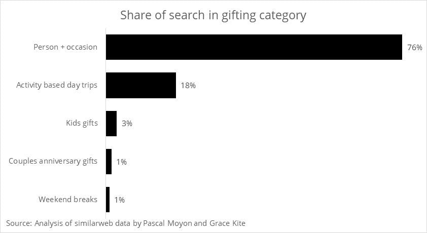 For example, in the chart above, which buckets searches in the gifting category, we can see straight away that most people looking for a gift put in something like ‘mum’s birthday’ or ‘father’s day’. The second biggest category is day trips organised around activities, where people search for ‘track day’, ‘spa day’ or ‘photo shoot’.