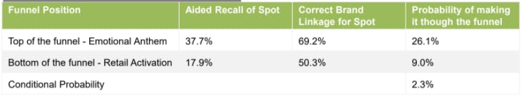 These are disappointing but not unusual statistics. But for the long and short to work its magic we need to combine them and look at how many people in the target audience successfully recalled and associated both the brand and activation campaigns: 9% of 26% is just over 2% of the market. And even that tiny figure is based on the assumption that these recall scores do not decay – as we know they must – over time.