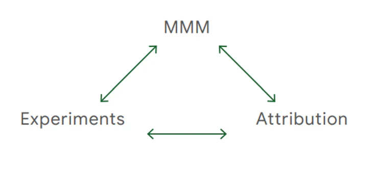 It says you should use MMM, experiments, and attribution together to get a view of what works: MMM takes care of the big picture, attribution gets more granular, and experiments validate both.