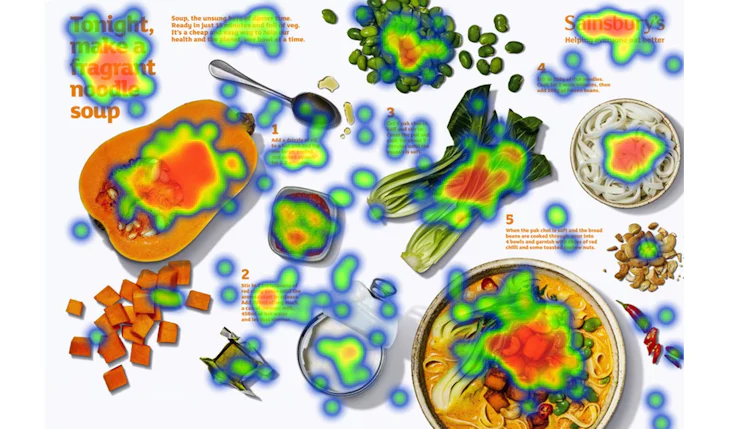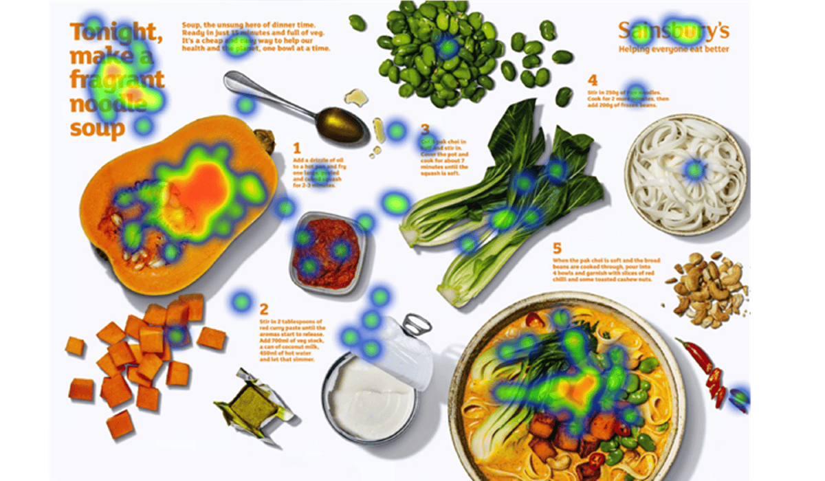 Indeed, further eye-tracking data reveals the ad to be one people will spend time with, looking not just at the eye-catching squash and title, but subsequently at the ingredients, the soup, the Sainsbury’s logo, and to some extent the recipe instructions.