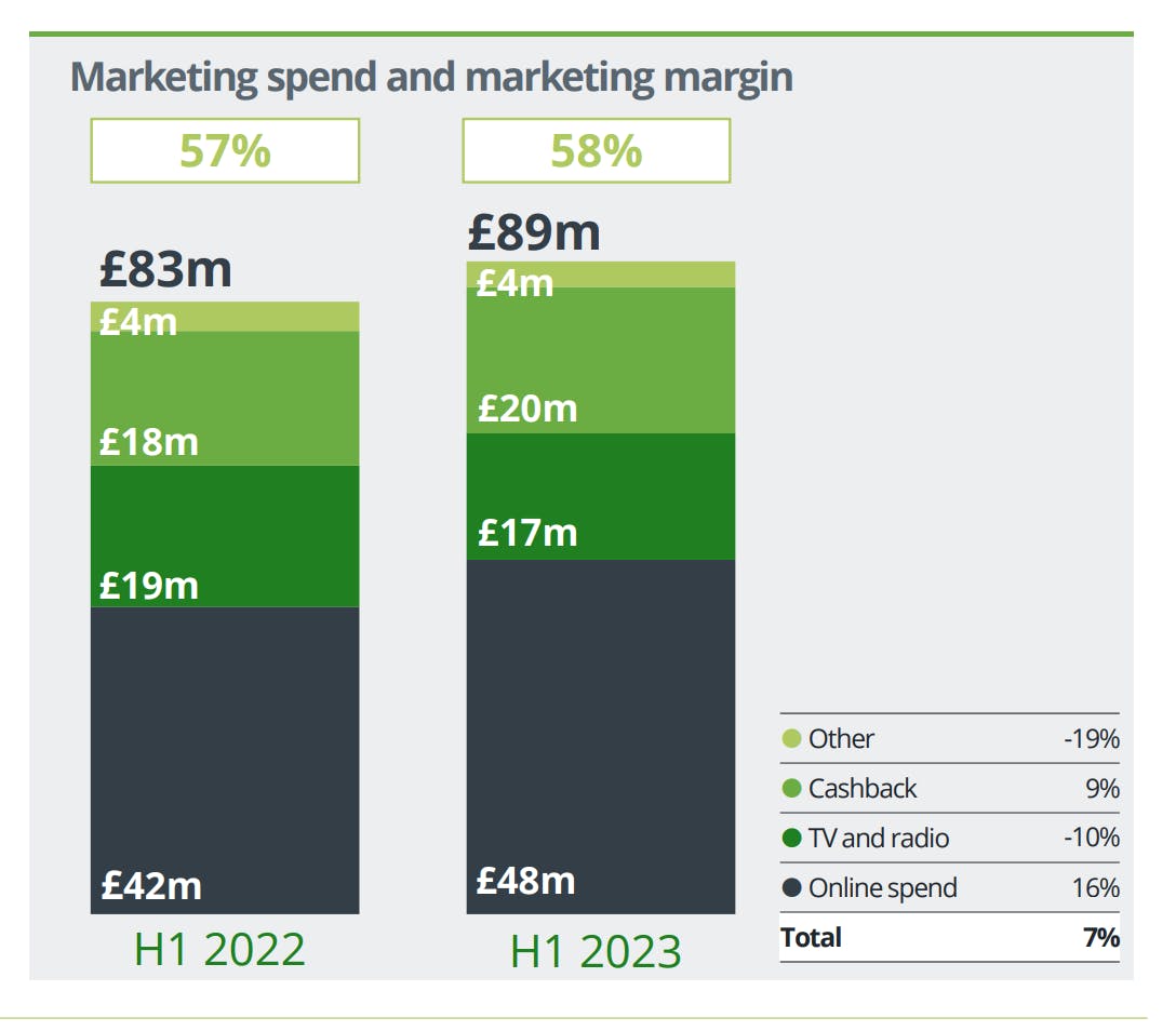 The company’s marketing spend increased by 7% year-over-year to £89m. It particularly increased its online spend, which rose to £48m, a 16% year-over-year increase. Cashback marketing spend also increase 9% in the year to £20m, while TV and radio was reduced by 10% to £17m.