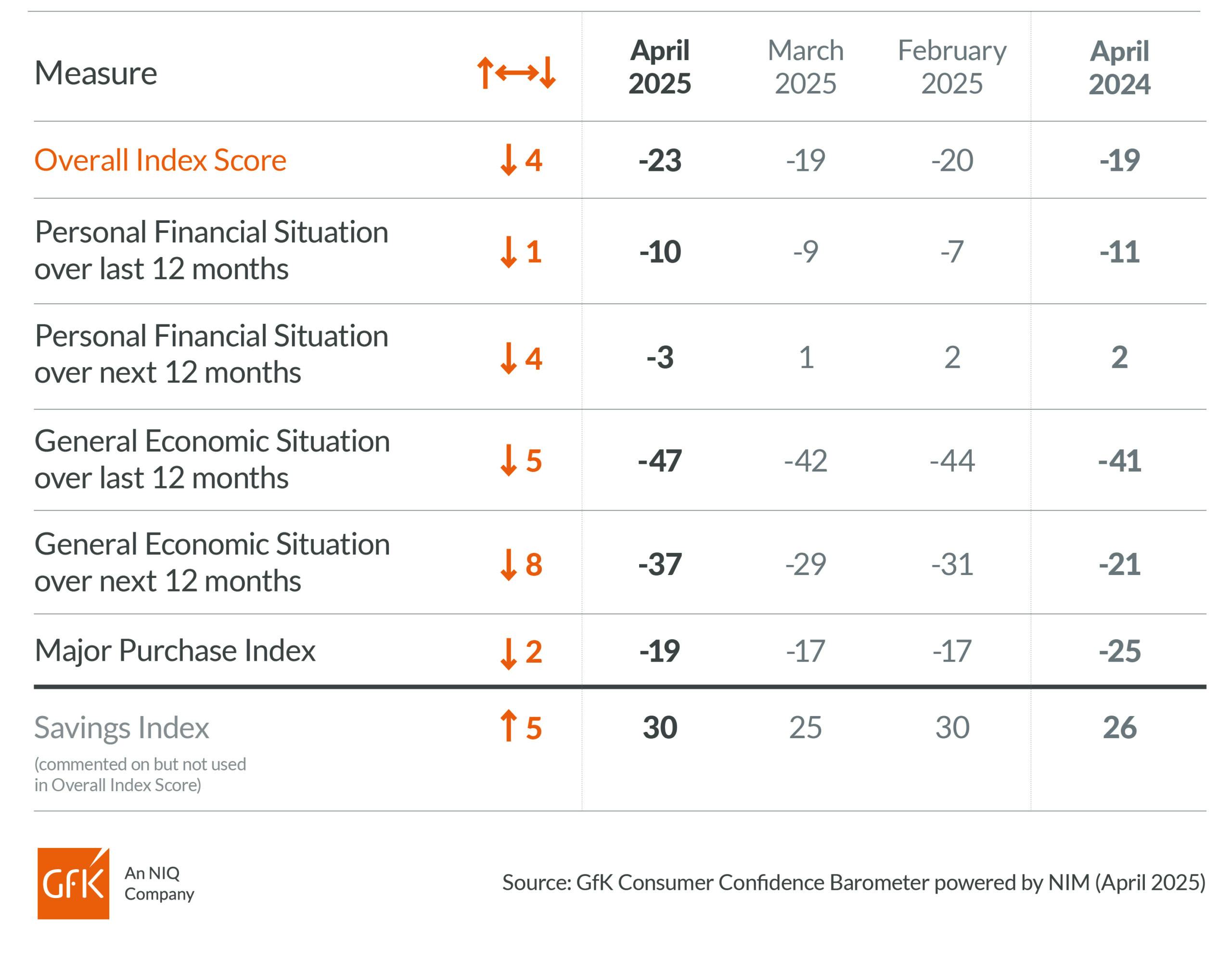 All five measures making up GfK’s Consumer Confidence Index have declined in April, putting the overall score at its lowest all year.