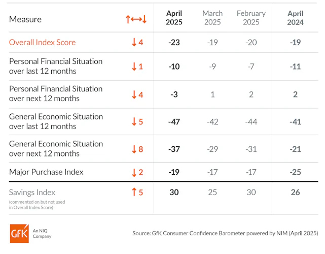 Consumer confidence has dropped by four points in April following the introduction of tariffs and ongoing economic impact, according to GfK’s Consumer Confidence Barometer.