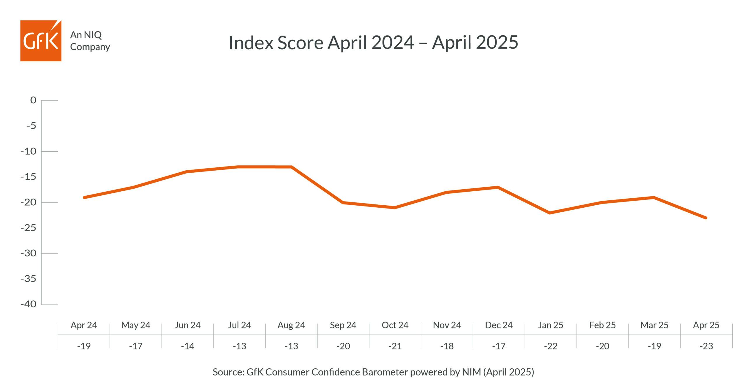 The overall index score, which brings together five different measures of consumer confidence, dropped to –23 in April, the lowest level it’s been all year. All measures were down in comparison to last month.